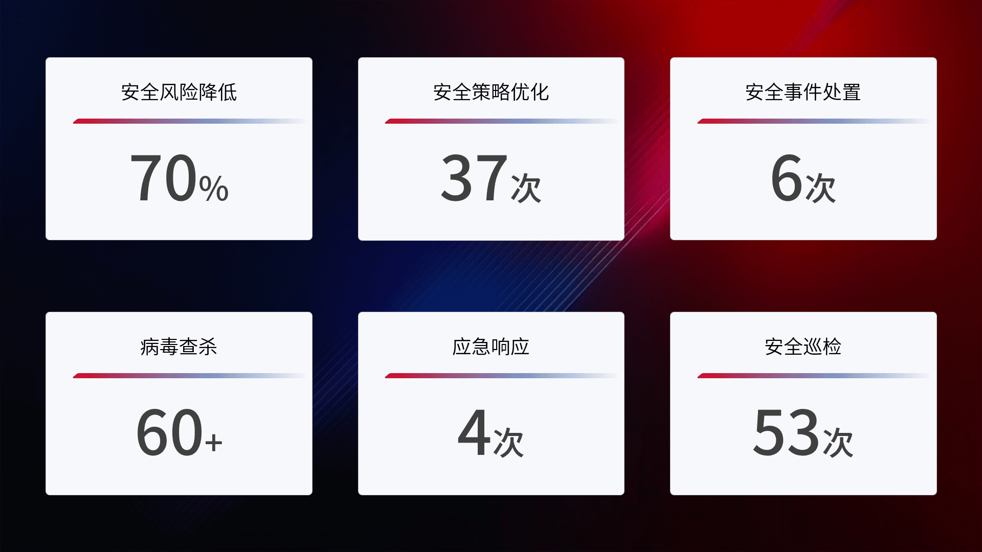 提供全面的安全事件报告体系,,,包括处置报告、、周报、、季度和年度总结,,,,结合持续监控,,,,帮助客户深入了解网络安全状况。。。