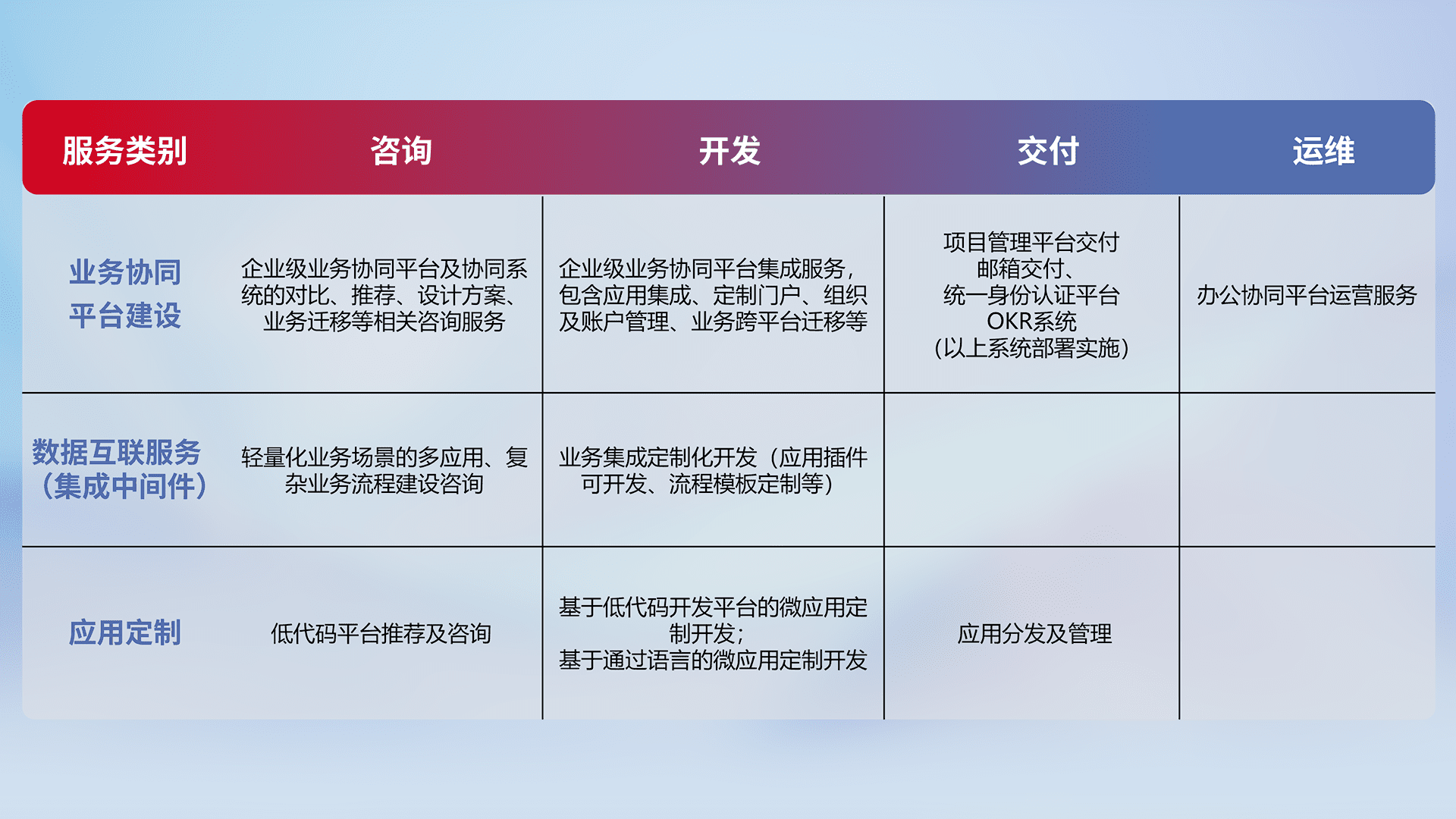 针对钉钉、、、企微、、IDaas等平台级产品提供产品的规划、、、方案、、交付、、定制化开发等服务,,实现如统一协同办公、、智能客户服务、、混合会议管理、、、智能数据查询、、等业务场景,,实现数字化转型。。。。